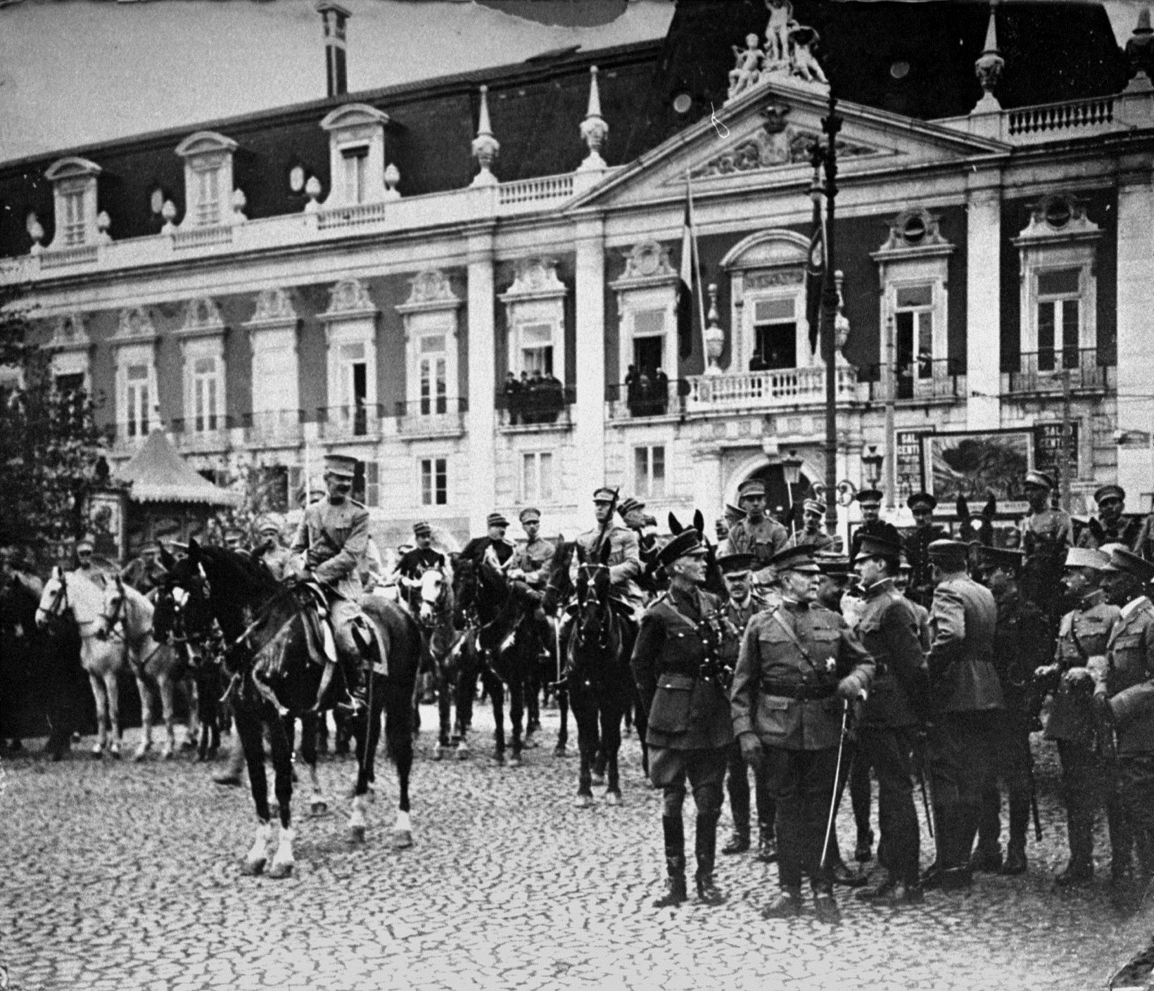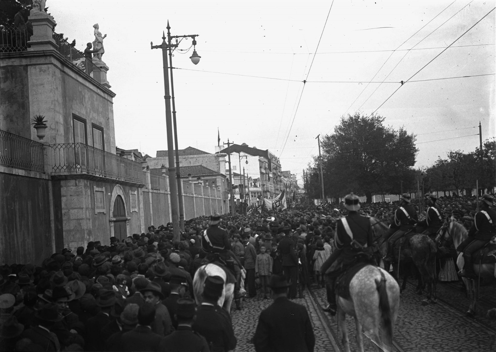Numa das varandas do palácio de Belém, Sidónio Pais, lê à multidão o telegrama do rei de Inglaterra felicitando Portugal pela sua participação na vitória dos aliados, 1918-11 JOSHUA BENOLIEL/ARQUIVO MUNICIPAL DE LISBOA